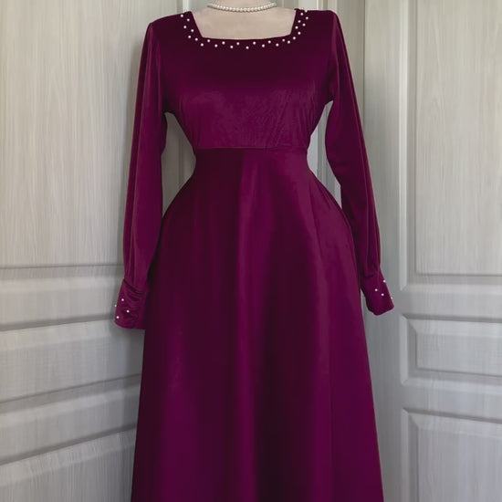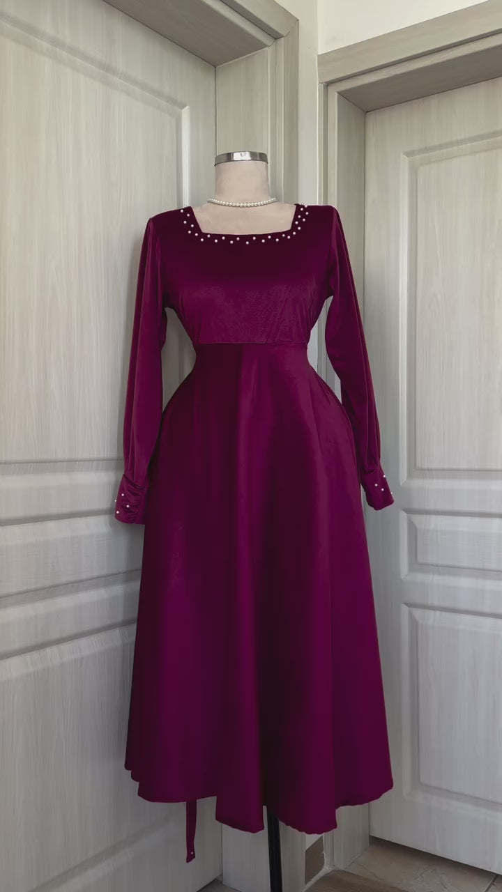 Crafted from premium velvet fabric, this frock features a flattering A-line silhouette with a soft flow and pearl-detailed neckline for a royal touch.